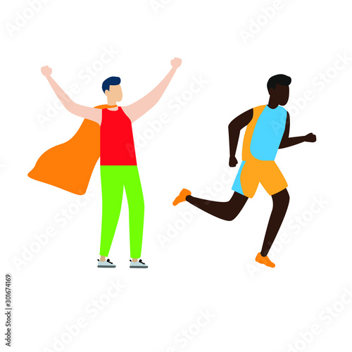 Set of flat cartoon character isolated with man in superhero cape and runner