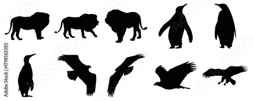 Set of flying eagle silhouette, cute black penguin silhouette, fierce black lion silhouette vector