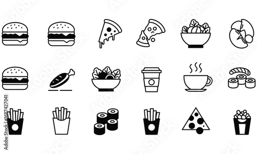Set of food and drink icons with coffee, pizza, burger, sandwich, cake, and dessert in vector illustration