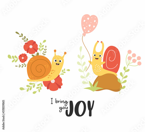 Set of forest snails. Funny snail characters on stone among grass with balloon and in flowers. Vector illustration. Concept I bring you joy. happy snail insects for cards, covers, design, decoration