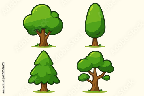 Set of four cartoon trees. Vector collection of various green tree illustrations for nature, forest, or park design. Eco-friendly plant and foliage graphic icons.