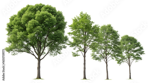 Set of four deciduous green trees PNG, realistic high-resolution transparent nature image for landscaping, design, and environmental projects.