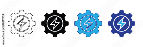 Set of four gear icons with lightning bolt symbol inside, representing energy, power, industry, and mechanics in various styles and colors.