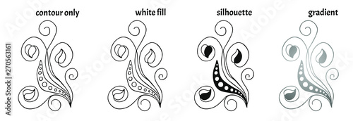 Set of four hand drawn nature branch pattern with leaves and peas in doodle style in different versions: contour only, white fill, silhouette, gradient. Colored isolated vector illustration