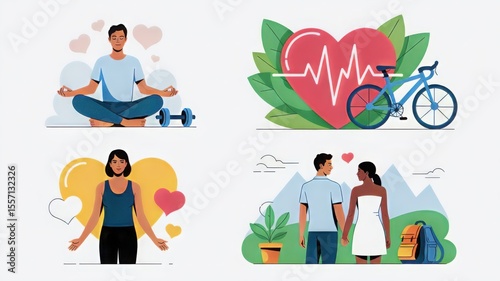 Set of Four Illustrations Promoting Health, Wellness, and Fitness"