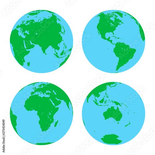 Set of four planet Earth globes with green land silhouette map on blue water background. Simple flat vector illustration.