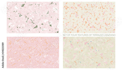 Set of four textures live coral, red, blue and black color in the style of terrazzo venziano. Pattern for ceramics marble natural stone