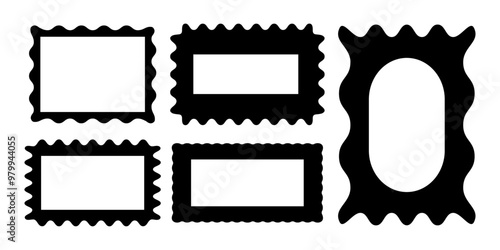 Set of frames for textbox. Speech bubbles. Geometric shape in black. Starburst. Label, seal, button, sticker, tag. Abstract icon. Collection with figures with wave and zigzags. Retro torn collage edge
