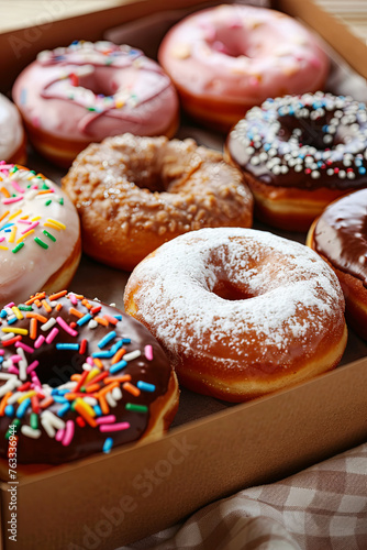 Set of fresh donuts in box close up