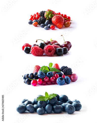 Set of fresh fruits and berries isolated a white background. Ripe currants, raspberries, cherries, strawberries, gooseberries, mulberries and bilberries. Mix berries on white background.