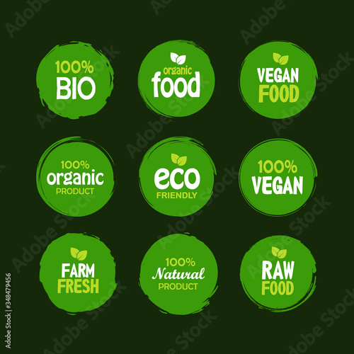 Set of fresh healthy organic vegan food logo labels isolated. Vector