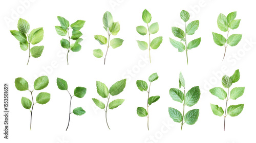 Set of fresh mint leaves cut out with vibrant green color natural texture and aromatic herb detail isolated on white background