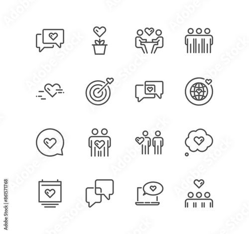 Set of friendship and love related icons, mutual understanding, interaction, assistance business, trust, social responsibility and linear variety vectors.