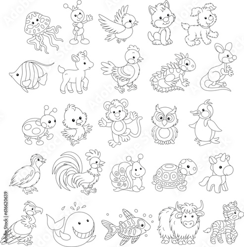 Set of funny cartoon toy Kawaii animals, black and white outline vector illustrations for a coloring book