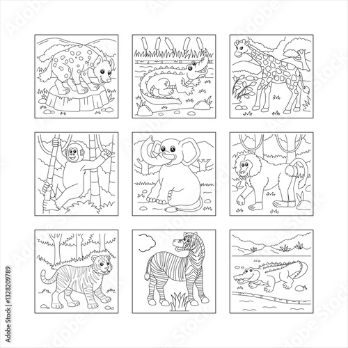 Set of funny hand-drawn animals coloring page for kids