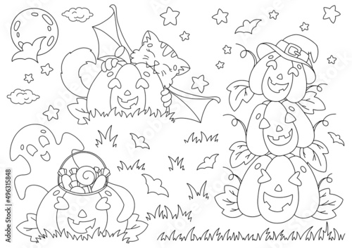 Set of funny pumpkins, bat, stars. Coloring book page for kids. Halloween theme. Cartoon style character. Vector illustration isolated on white background.