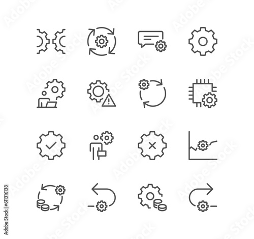 Set of gear related icons, engineering, process, settings and linear variety symbols.