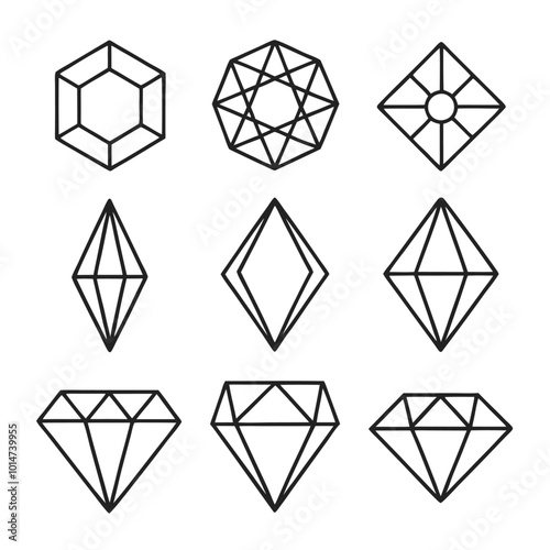 Set of geometric gemstone vector icons with outline style and faceted patterns for jewelry designs.Outline gemstone vector icons with clean geometric shapes, ideal for logos and decorative elements.