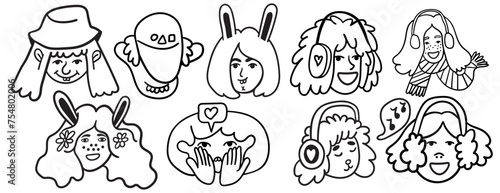 set of girls portrait in doodle style in vector. line art for avatar design sticker coloring postcard poster print