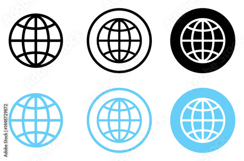 Set of globe vector icons. Globe world icons in black and blue color. Earth symbol collection with circular Internet and global network designs. Planet earth world map in different variations.