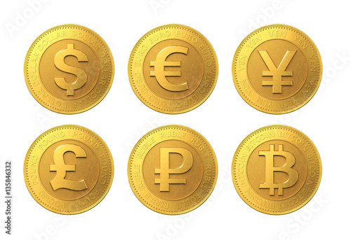 Set of golden coins with dollar, euro, pound sterling, ruble, bitcoin and yen signs. 3d rendering.