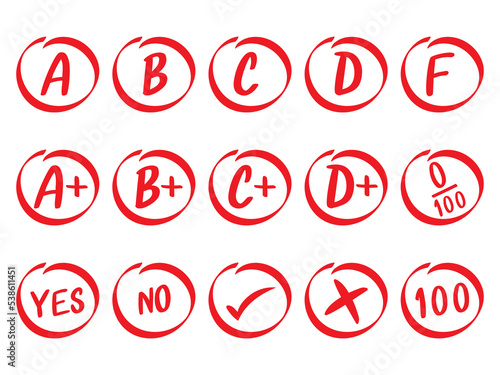 Set of grades in red circles on white background. Test Score Report Tick Skip Yes No Excellent school or college hand drawn results. vector illustration.