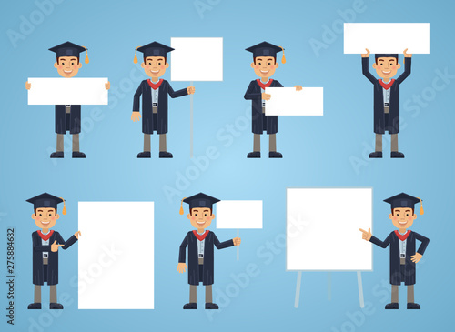 Set of graduate characters posing with different blank banners. Cheerful graduate with paper, poster, placard, pointing to whiteboard, teach, advertise, promote. Flat style vector illustration