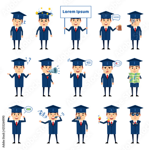 Set of graduate student characters showing various actions, emotions. Cheerful graduate reading map, holding signboard, sleeping, singing and showing other actions. Flat vector illustration