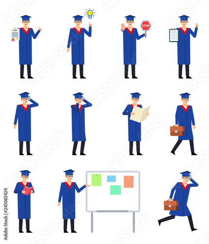 Set of graduate students showing various actions. Graduate in blue robe holding document, talking on phone, reading and showing other actions. Flat design vector illustration