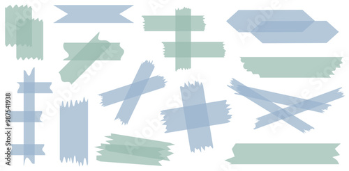 Set of green and blue semi-transparent washi tapes isolated on white. Tapes collection in vector. Pieces of decorative tape for scrapbooks. Torn paper
