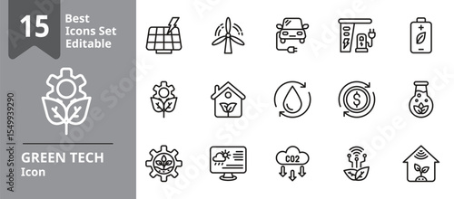 Set of Green Tech icons. Contains solar panels, wind turbines, electric vehicles, recycling, etc . Design elements for you projects. Editable stroke vector illustration