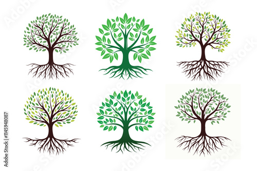 Set of Green Tree Logos with Roots and Leaves - Nature-Inspired Eco-Friendly Designs