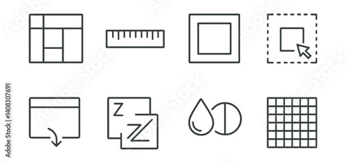 Set of grid, ruler, frame, cursor, dropdown, sleep, drop, contrast, checkerboard.
