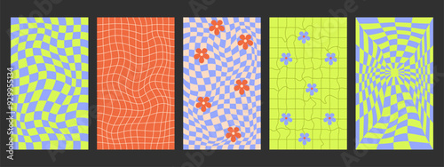 Set of groovy psychedelic chessboard and twisted pattern in trendy retro trippy style. Y2k aesthetic. Vector illustration