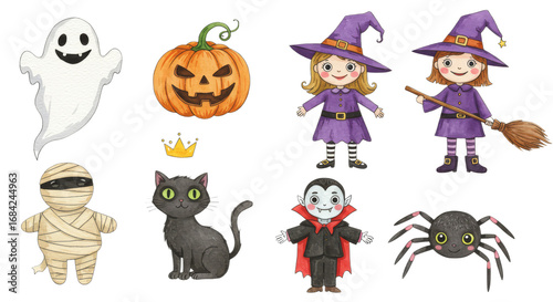 Set of Halloween character icons isolated on white background PNG. Cute and spooky 3D characters, pumpkins, ghosts, witches, bats, skeletons, and Halloween party elements for decoration and digital