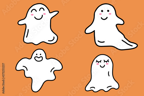 Set of halloween cute ghosts. Cartoon doodle ghost character collection isolated on orange background. Vector illustration.