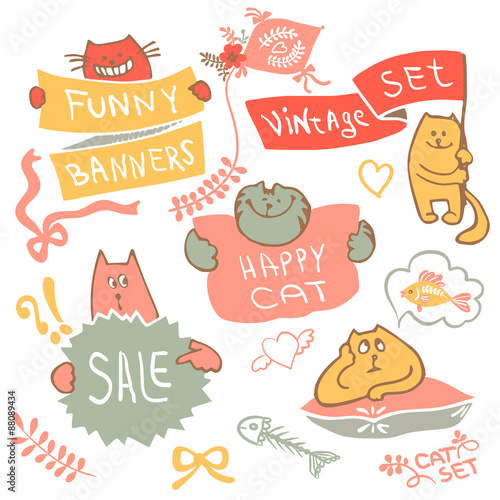 Set of hand drawing cat with banner logo vector.