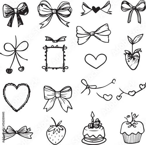 Set of hand drawn coquette ribbon decoration black and white