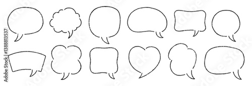 Set of hand drawn crayon, charcoal, chalk speech bubbles in doodle style. Outline text boxes on a white background. Vector illustration.