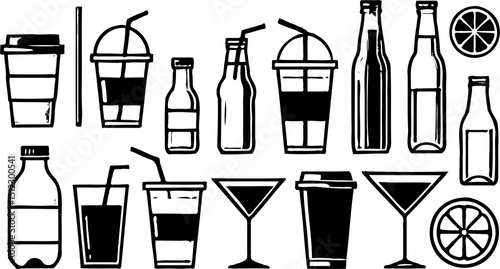 Set of hand drawn drinks icons. Cocktails and drinks set. Black and white illustration, drinks and food. Cocktail, Alcohol, Bottles and glasses, beer, whiskey, cognac, whiskey, wine, whiske
