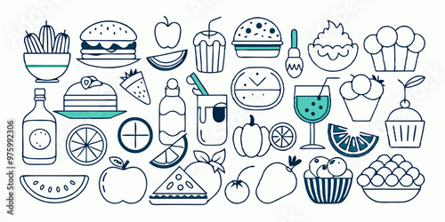 set of hand drawn illustrations of fast food, cakes, fruits, drinks vector line art
