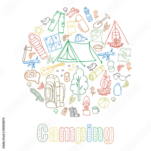 Set of hand drawn sketch camping equipment symbols and icons. Vector illustration.
