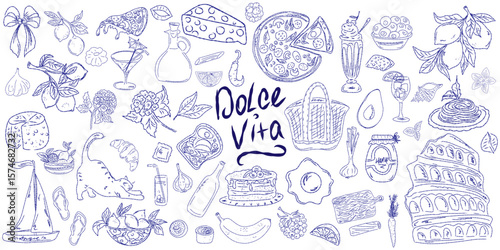 Set of hand drawn summer food icons. Mediterranean la dolce vita. Sketchy whimsical style