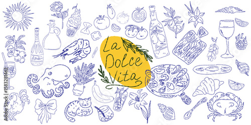 Set of hand drawn summer food icons. Mediterranean la dolce vita. Sketchy whimsical style