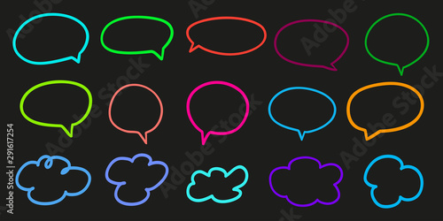Set of hand drawn think and talk speech bubbles on black. Line art. Colorful illustration