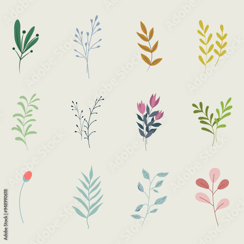 Set of hand drawn vector floral elements for decoration. Branches, flowers, leaves and petals for frames and cards. Botanical collection