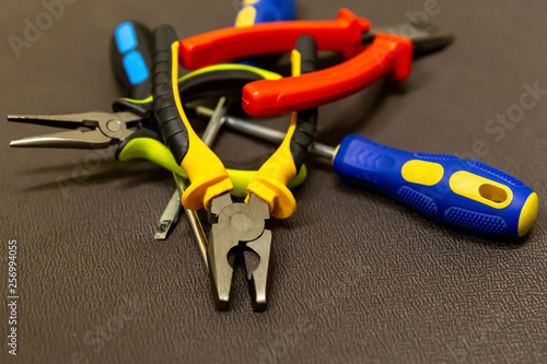 set of hand metal tools close-up of a bunch of objects repairing workshop pliers screwdriver close-up