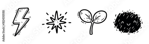 Set of hand-drawn icons: lightning bolt, sparkle, sprout, smiling circle