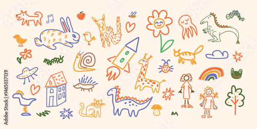 Set of hand-drawn playful doodles in colorful childlike style. Rabbit, dinosaur, rocket and children. Animals, flowers and fun decorative elements. Vector illustration for banner, social media