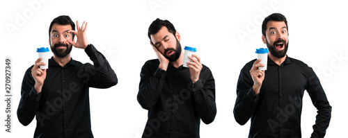 Set of Handsome man with beard coffee to take away